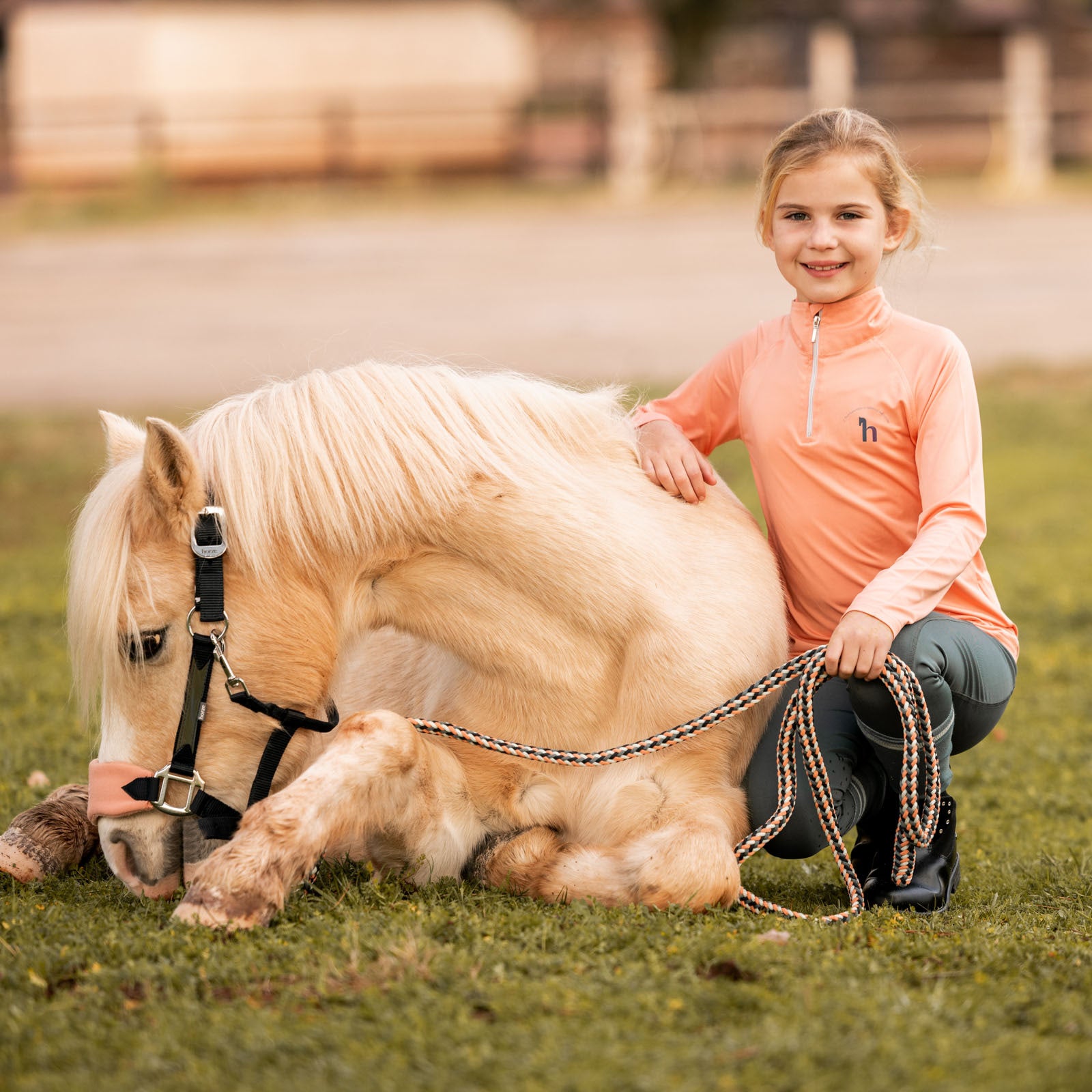 - Small chest print with script and iridescent Horze logo